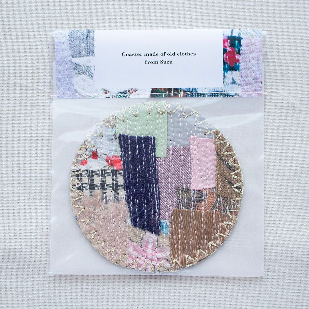 古布の端切れを組み合わせ、ミシンでランダムにステッチを重ねたコースター。