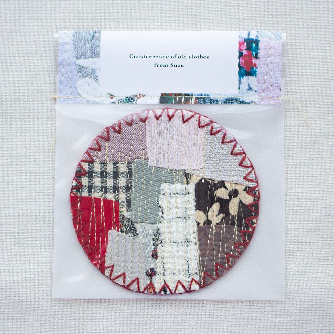 古布の端切れを組み合わせ、ミシンでランダムにステッチを重ねたコースター。