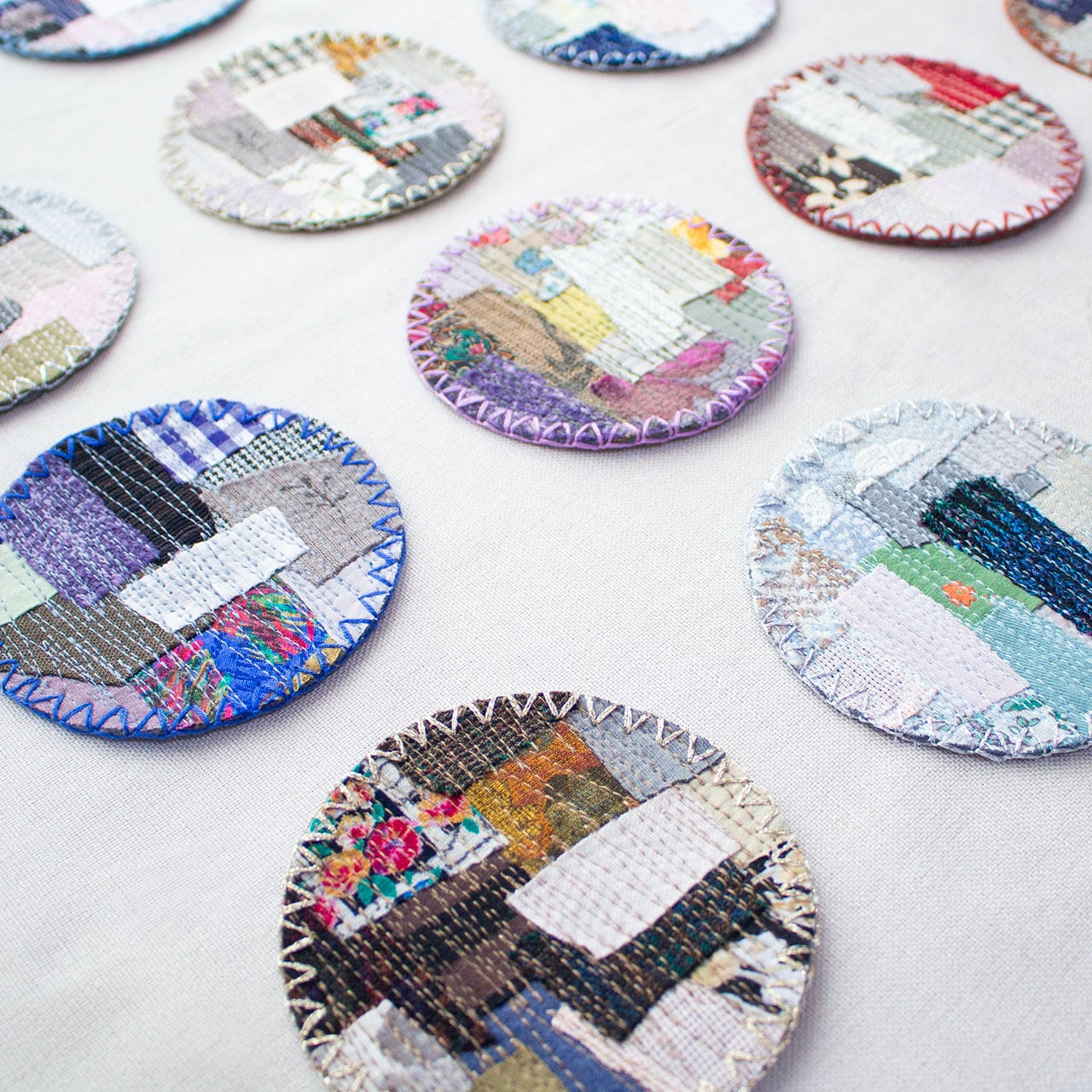 古布の端切れを組み合わせ、ミシンでランダムにステッチを重ねたコースター。
